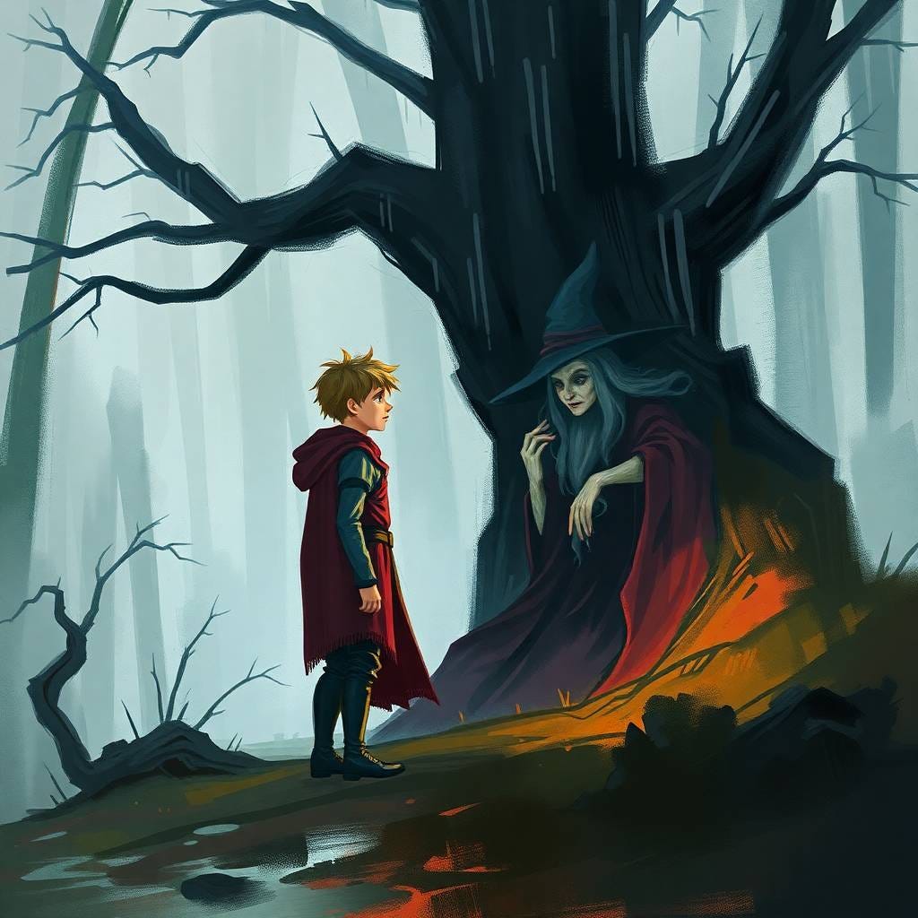 At that moment a shivering crept over me. A sharp cold penetrated my bones. I could hear a sweet voice whispering, soothing & feminine, inviting me into her caress. Before I knew it I was in the arms of an old witch, curled up in a fetal position sucking my thumb, as if I was a baby at it’s mothers teat. “There there,” she said. “Don’t cry. It’s ok. Mommy’s here." The details following get blurry, as if I suffered a blackout. The next thing I remember is waking up in a strange bed in a bewitched hut.